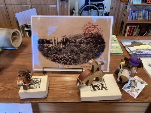 ↑ 写真は、かつて八幡牧場で放牧されていた那須駒の写真や那須駒をデザインした五十嵐豊さんの木の作品、那須町黒田原のキャラクター「クロロとゆめな」